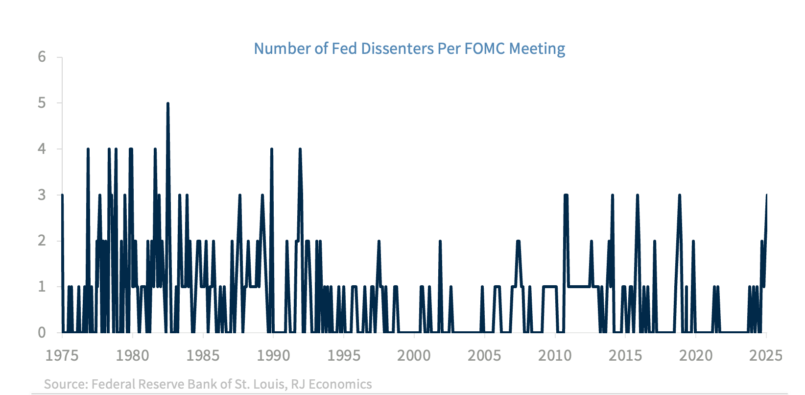 Although there was no mention of the administration’s efforts to influence the Fed to push interest rates much lower and much faster, “… several participants pointed to the risk of higher inflation becoming entrenched and suggested that lowering the policy rate further in the context of elevated inflation readings could be misinterpreted as implying diminished policymaker commitment to the 2 percent inflation objective.” That is, many FOMC members were clearly concerned about not bringing down inflation to the 2% target faster and that this could be construed as not being committed to the inflation target, which could help de-anchor inflation expectations.