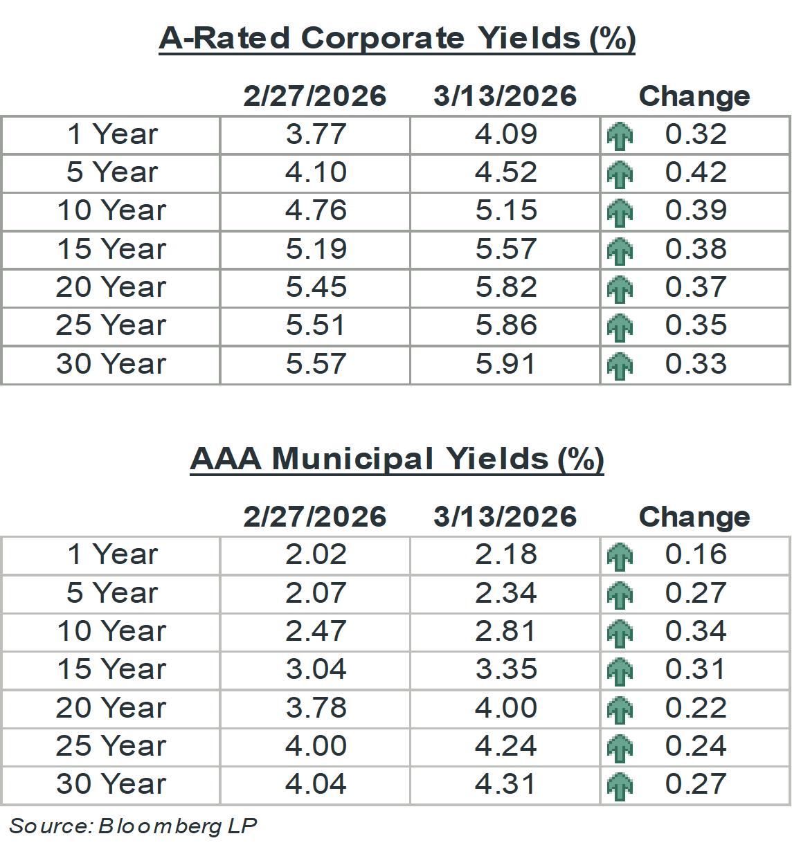 What’s the takeaway for fixed income investors? High-quality yields across the fixed income landscape have become more attractive, creating a good opportunity to lock in attractive yields. In the intermediate and long-end of the municipal curve, which is where most of the value is in that market, yields are 25 to 35 basis points higher. This translates to taxable equivalent yields of 7% or higher for top tax bracket investors. In the corporate market, in addition to higher benchmark (Treasury) yields, spreads have widened over the past few weeks, helping to push yields even higher. A-rated yields in the intermediate part of the curve are higher by 30 to 40 basis points, reaching levels not seen since last July. As the past few weeks have reminded us, there is a lot of uncertainty in the world and things can change quickly. What we do know is what is available right now: high-quality bonds offering attractive yields that can be locked in for years to come. Contact your financial advisor to see available fixed income opportunities that line up with your long-term financial plan.